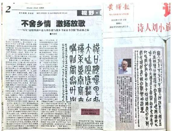 2011年4月6日,黄骅市委宣传部举办“故土乡情——贾漫 刘小放诗歌朗诵会”,韩焕峰先生应邀参加,并到宾馆看望二位先生。韩先生曾为他们刻过多枚印章,这次借去黄骅之便,他带去自己的几本书法篆刻专辑分赠与二位先生。贾老阅后,当即赋诗回赠:“草莽饥鹰韩焕峰,铜头铁爪铸真经。腕中大篆加行草,一扫平庸狡兔空”。诗文仅28个字,将韩先生刻画得淋漓尽致,可窥二位先生的深情厚谊。2014年11月12日,由黄骅市委宣传部主办的“诗情墨韵——诗人刘小放与故乡书家诗书作品展”,在黄骅市博物馆隆重开幕。韩先生又受邀用篆书写下小放先生歌颂家乡的两副对联和一首七绝诗及一首诗歌参加展览,并专程返回家乡黄骅参加了开幕式。开幕前,为了配合此次展览宣传,焕峰先生又亲自撰文写了题为《不舍乡情 激扬放歌》两千余字的评论文章,发表在2014年11月12日的《黄骅报》上,充分体现韩先生对家乡的情怀和与刘小放先生的深情厚谊。