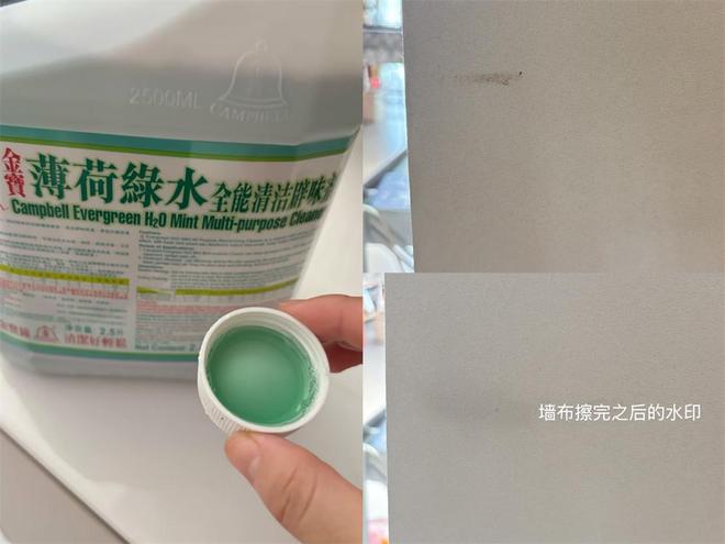 墙纸墙布上的轻微划痕、脏污,甚至都可以用清洁海绵沾上一点这薄荷绿水进行擦拭(稍微一点就行,别太多),反复擦拭几遍,甚至能淡化墙面上的顽渍,清洁效果肉眼可见。