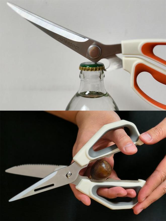 除此之外,两把剪刀还有诸多的功能设计,比如大剪刀手柄中间的锯齿状金属,其实是个坚果破壁器,用来夹核桃榛子之类的硬壳坚果轻而易举。