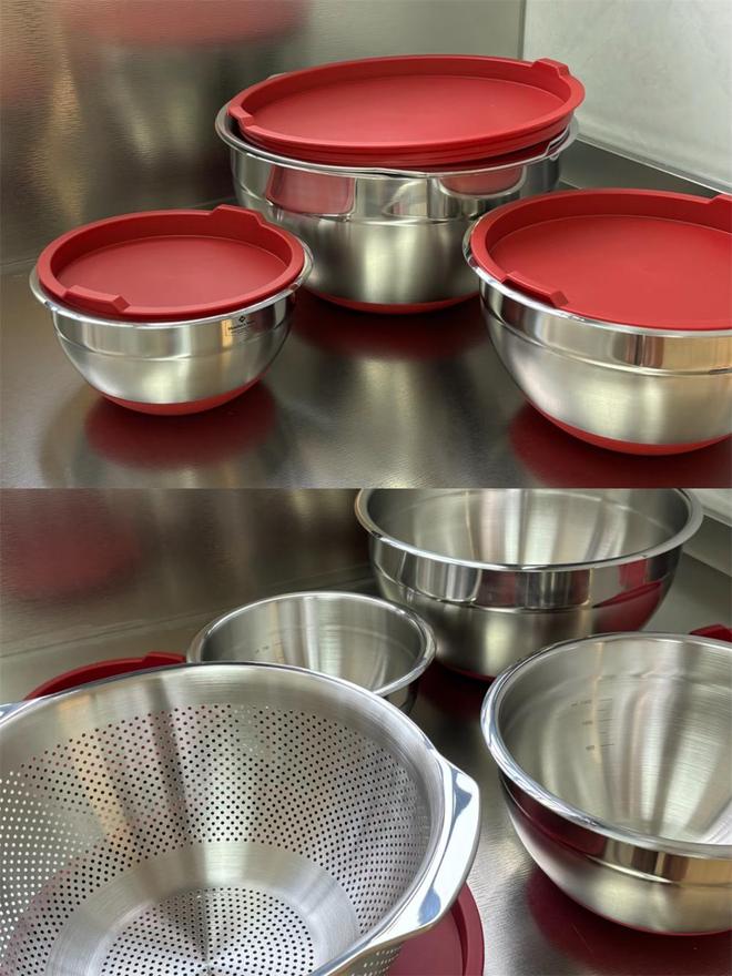 最后就是这种不锈钢料理碗啦,它一盒有四件,分别是三个不同尺寸的盛碗,和一个网眼细密的滤碗,用来洗菜、备菜最合适不过,三种尺寸的盛具,也能适应蔬菜肉类等不同食材的盛装需求。