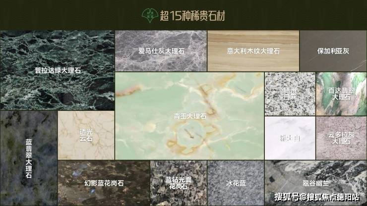 ▌【材质篇】 15全球甄选超15种珍贵石材,奢侈品旗舰店级用料涵盖PRADA旗舰店御用普拉达绿、悦系代表奢石青玉、巴西国宝级奢石百达翡翠等15种稀贵石材